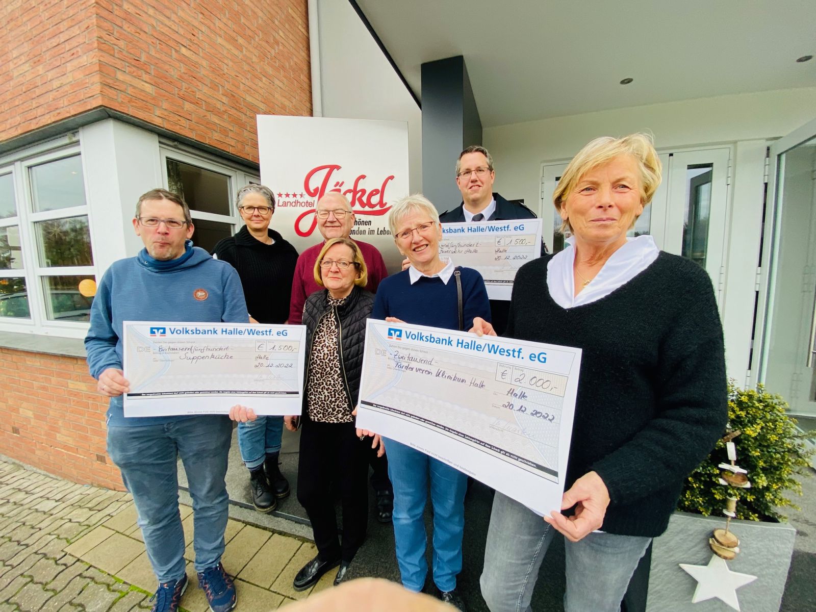 Spendenübergabe vor dem Landhotel Jäckel in Künsebeck. Sebastian Plath und Beate Wolff von der Suppenküche der evangelischen Kirche, die Spender Paul und Marianne Marten, Maria Heckmann und Annette Gontek vom Förderverein des Klinikums Halle (von links) und Christian Herden (hinten) von der Feuerwehr bekamen einen Briefumschlag mit Geld für ihre Einrichtung. Foto: Herbert Gontek